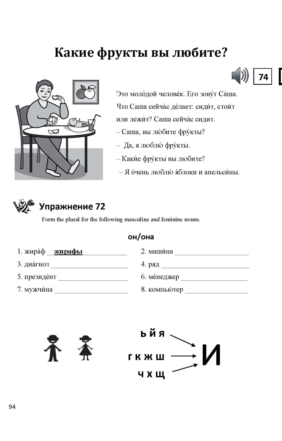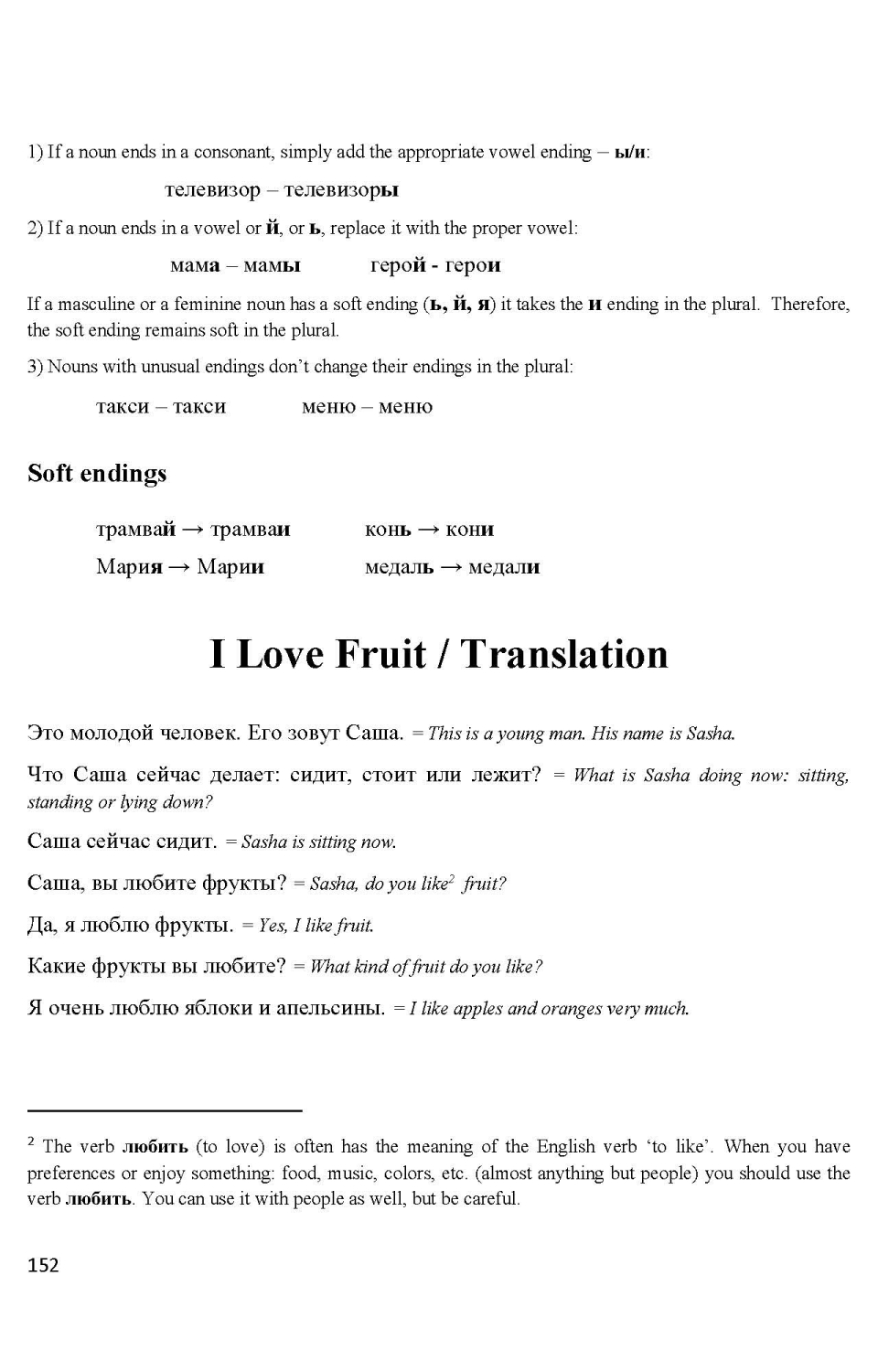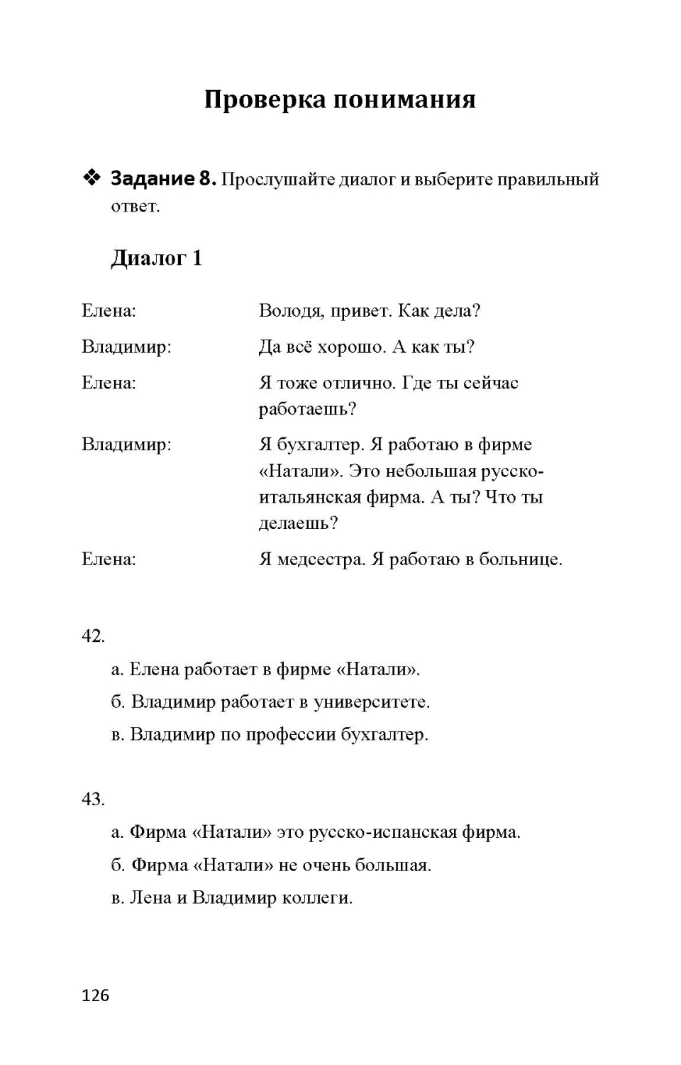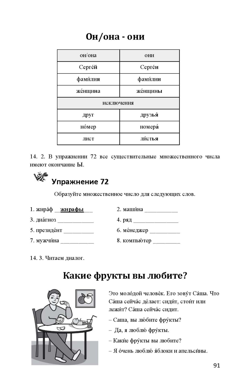 - Vocabulary (colors, family, first name, last name, patronymic, informal names, which name to use and when, professions, calling on the phone, nationalities, I love fruit, I work for the firm, they live in, going to the theater)