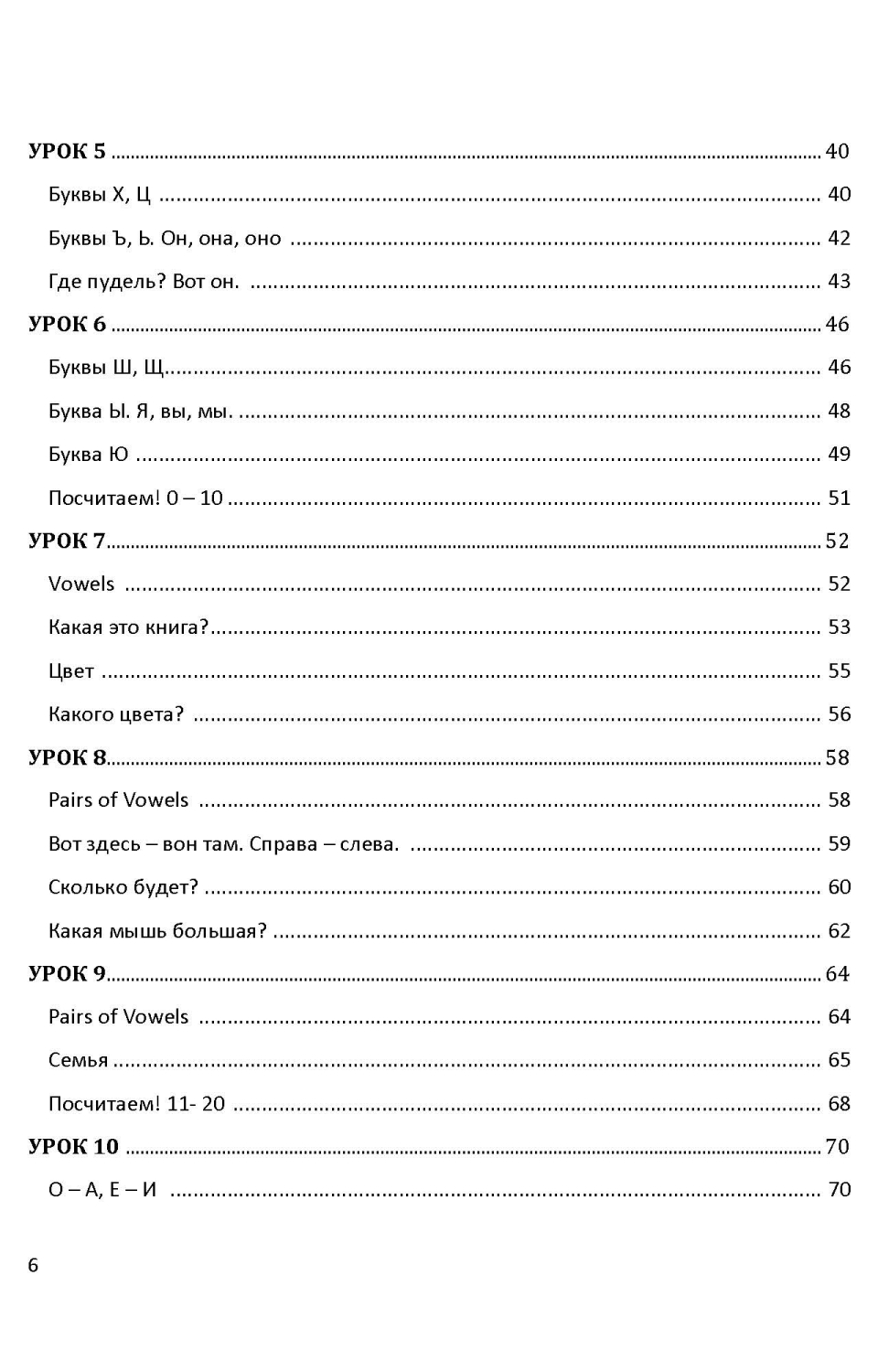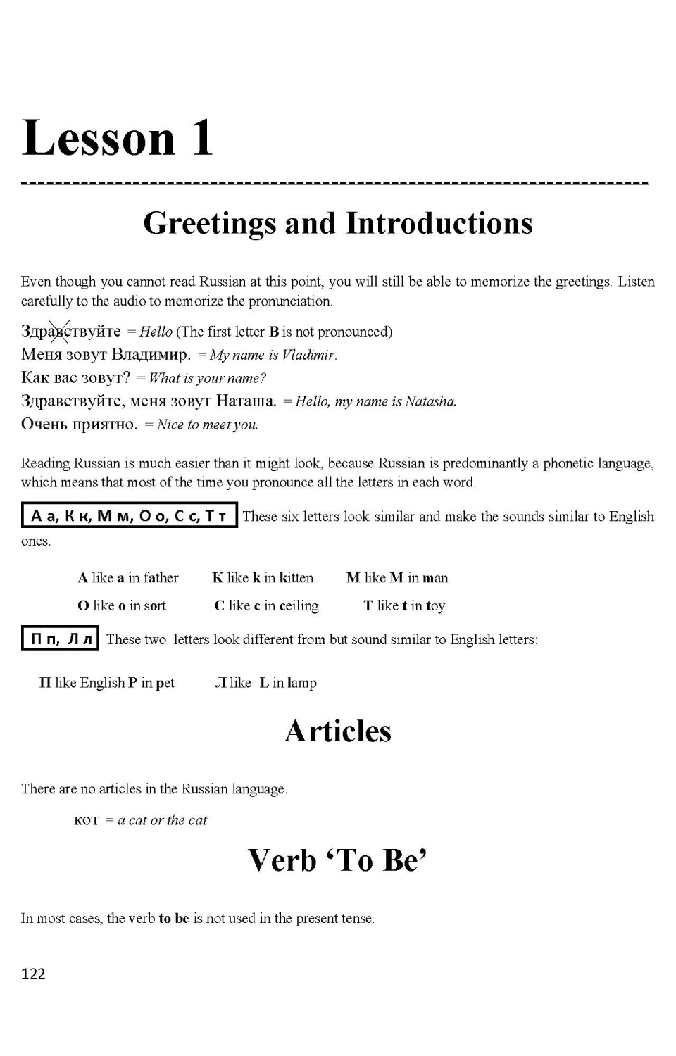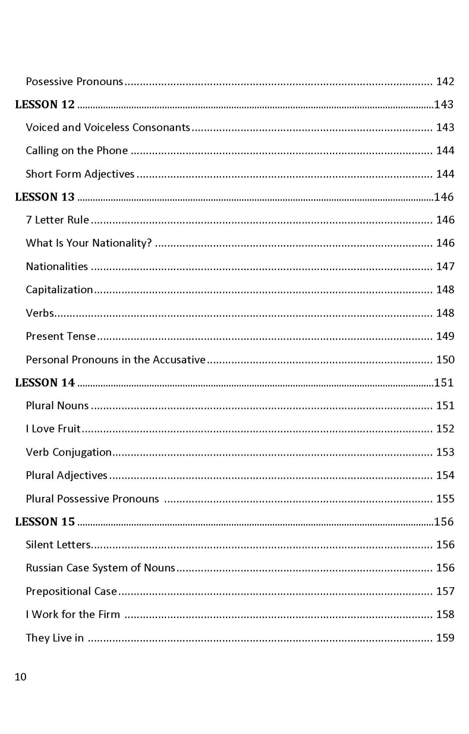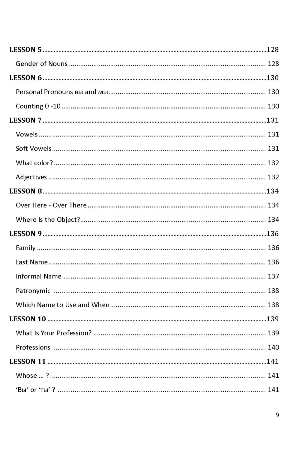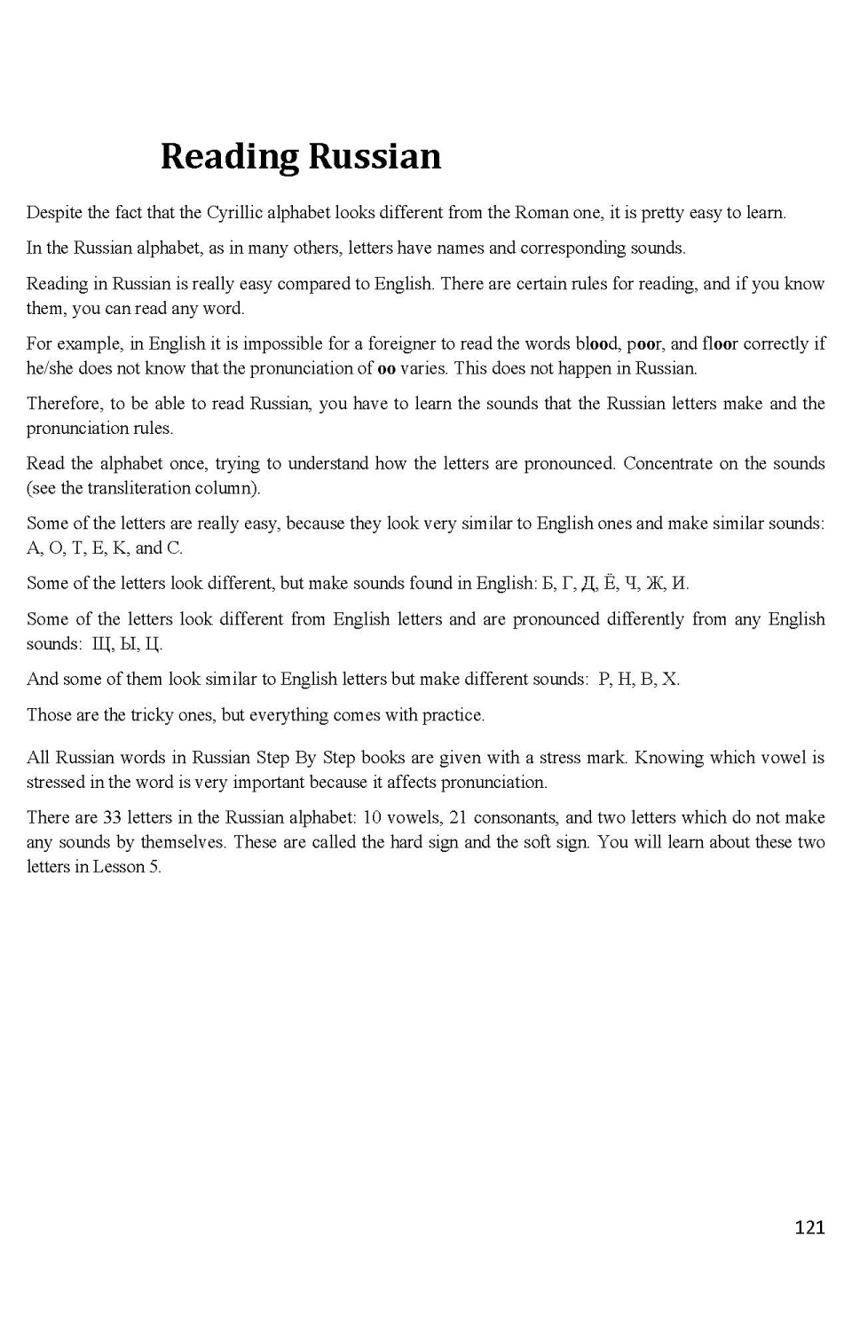 The first 6 lessons teach the students how to read and write in Russian. The Russian Alphabet is introduced in a special order that allows the students to start reading words and sentences from lesson one. The letters are supported by basic vocabulary and grammar structures that allow the student to speak from the very first page: