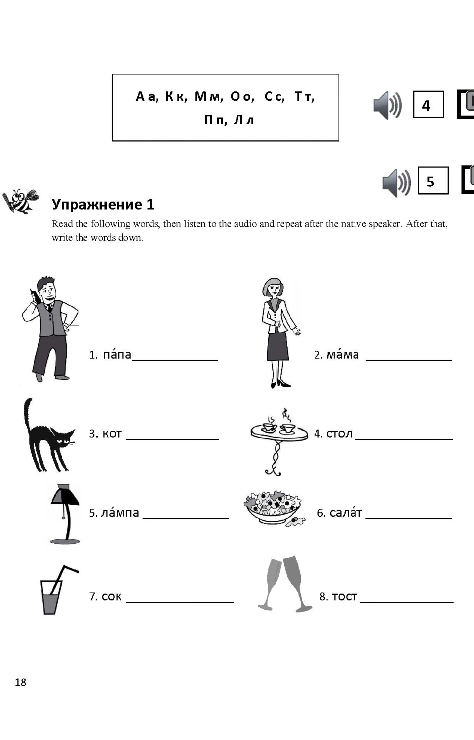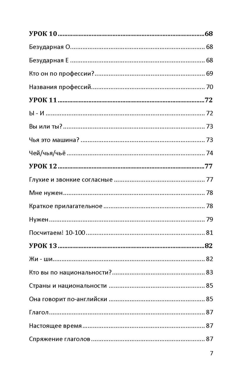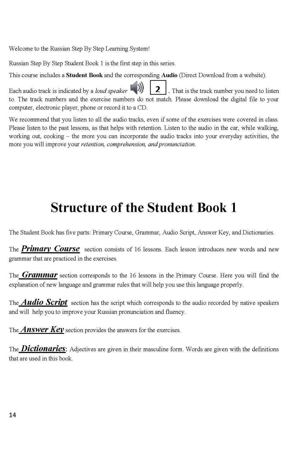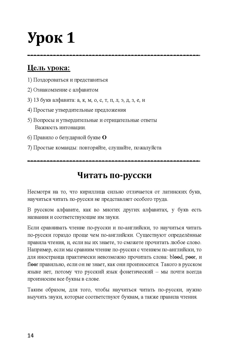 The first 6 lessons teach the students how to read and write in Russian. The Russian Alphabet is introduced in a special order that allows the students to start reading words and sentences from lesson one. The letters are supported by basic vocabulary and grammar structures that allow the student to speak from the very first page:
