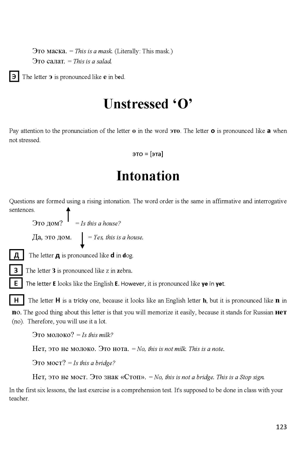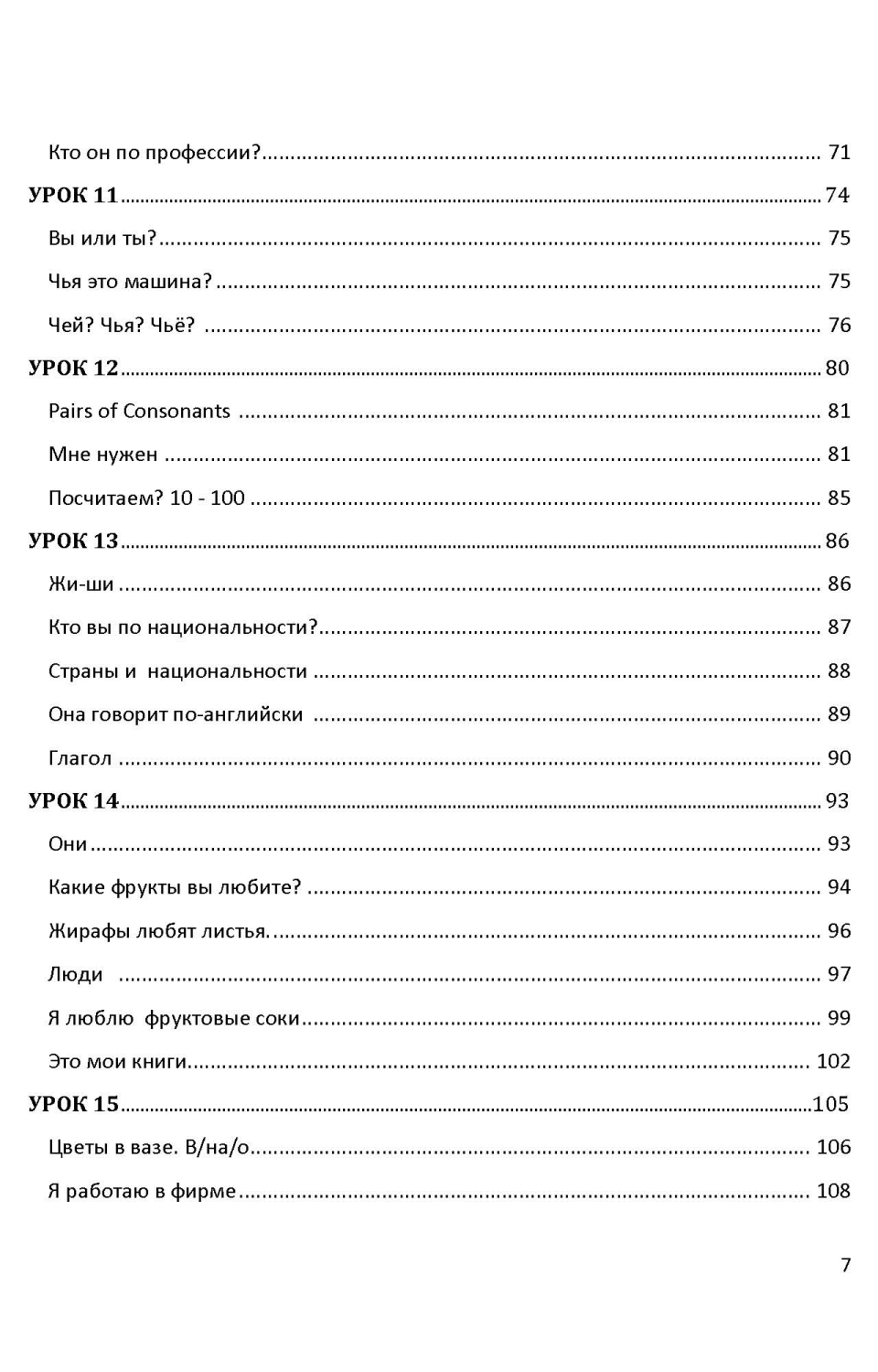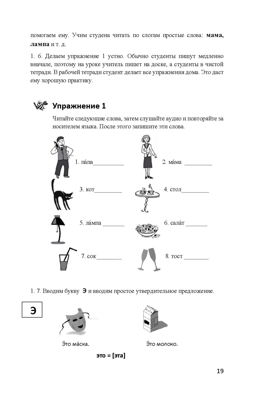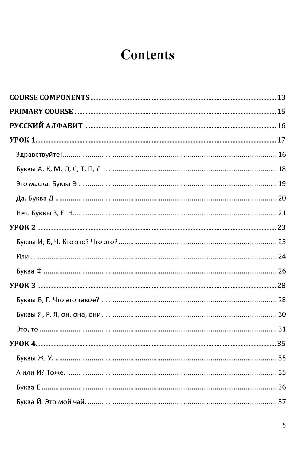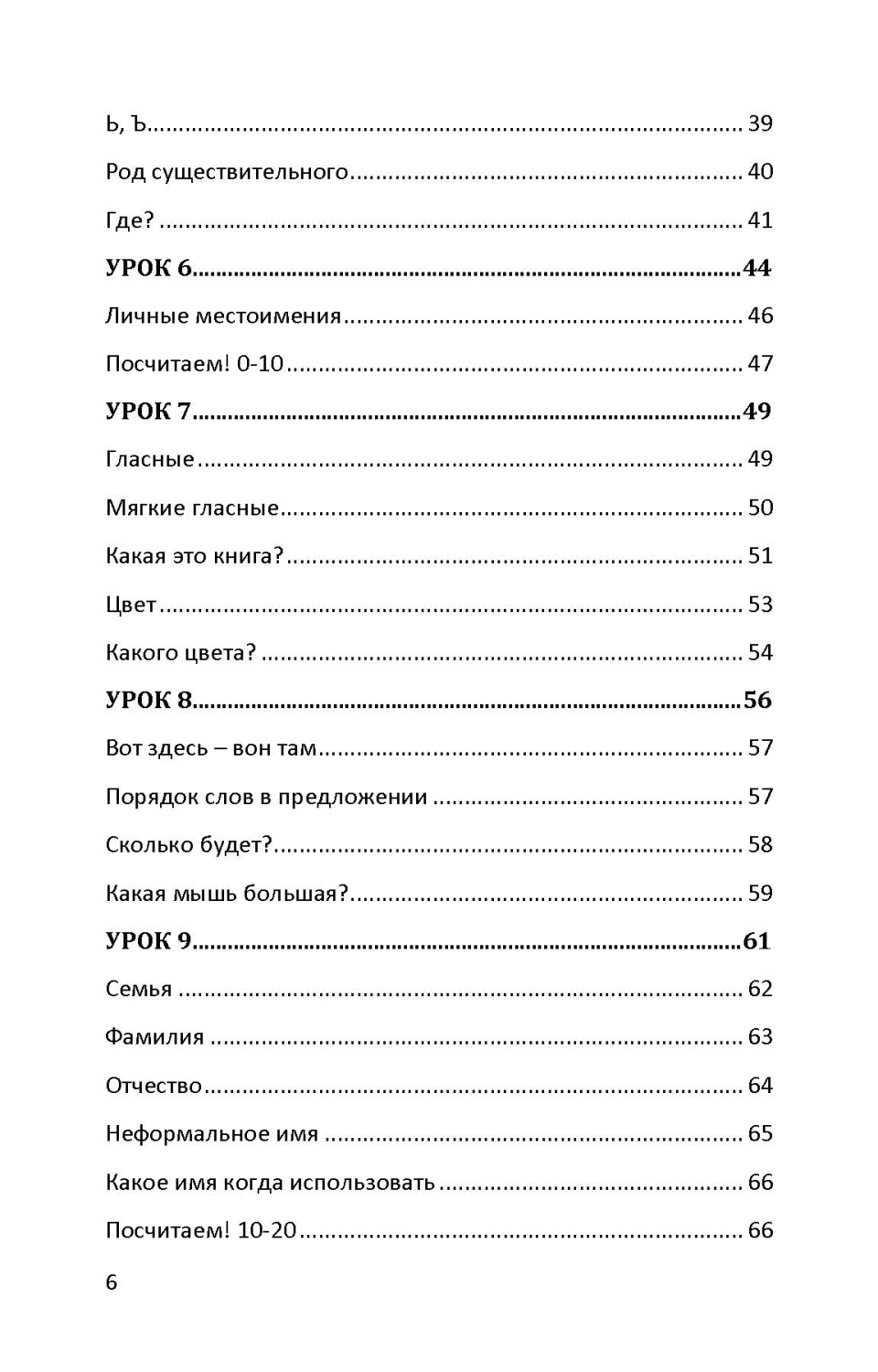 The first 6 lessons teach the students how to read and write in Russian. The Russian Alphabet is introduced in a special order that allows the students to start reading words and sentences from lesson one. The letters are supported by basic vocabulary and grammar structures that allow the student to speak from the very first page: