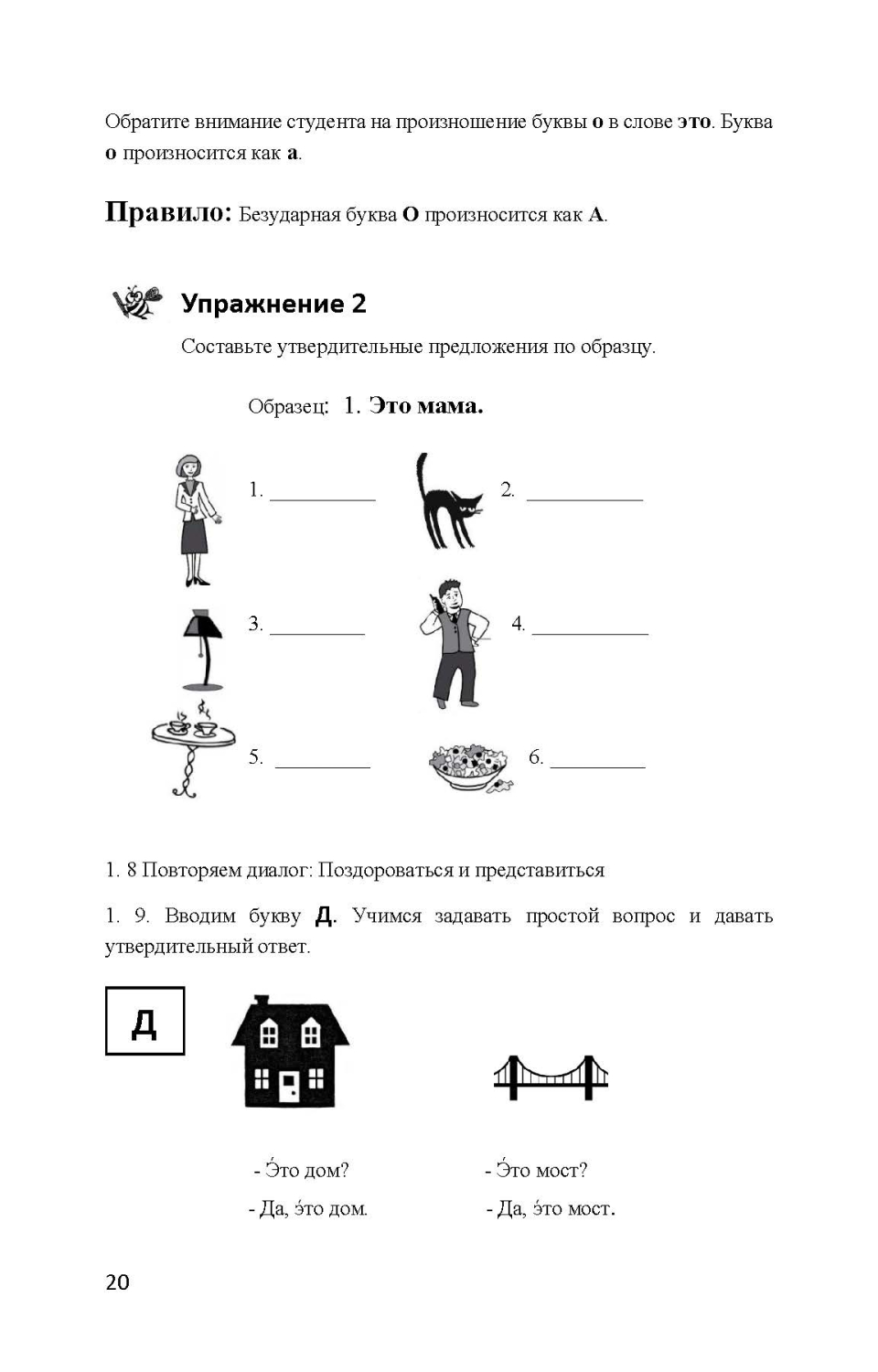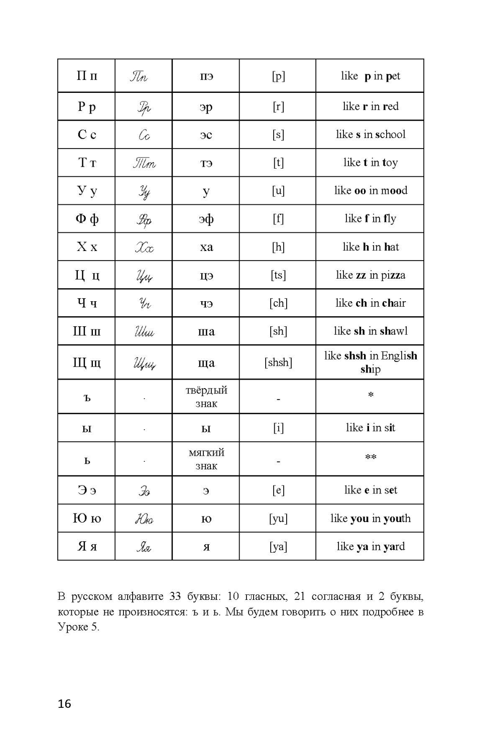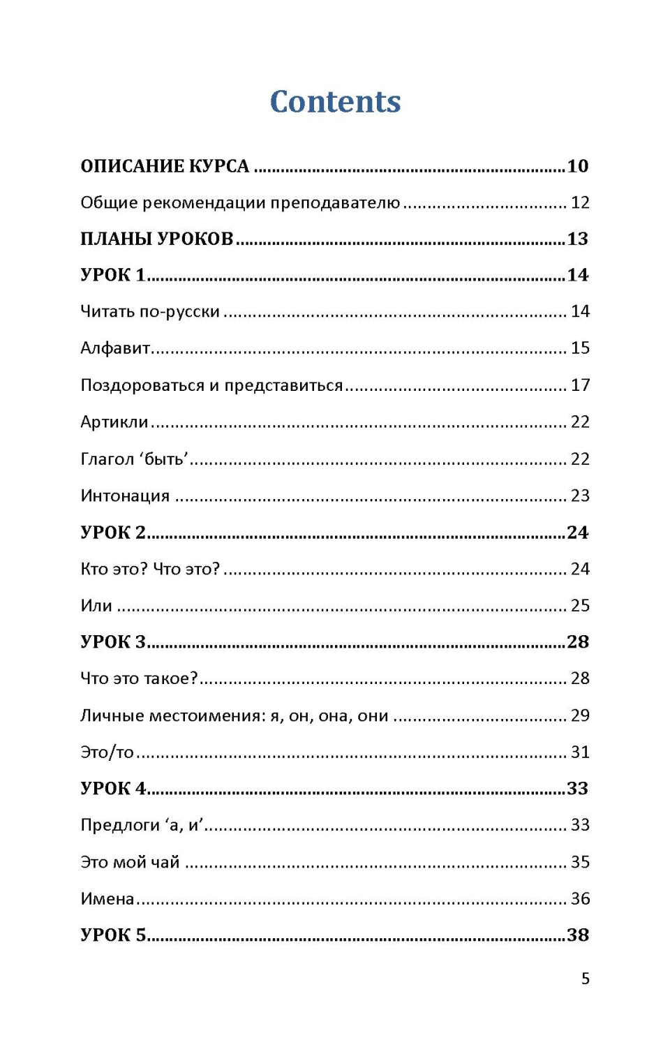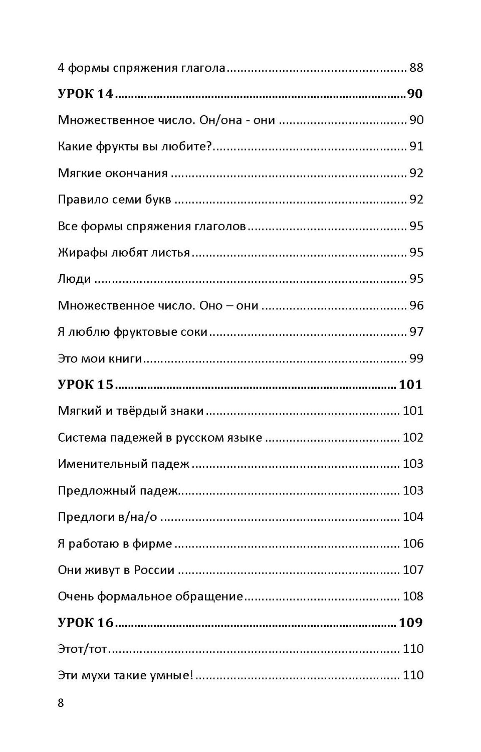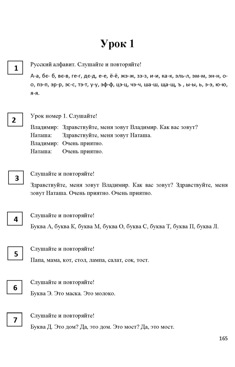 The first 6 lessons teach the students how to read and write in Russian. The Russian Alphabet is introduced in a special order that allows the students to start reading words and sentences from lesson one. The letters are supported by basic vocabulary and grammar structures that allow the student to speak from the very first page: