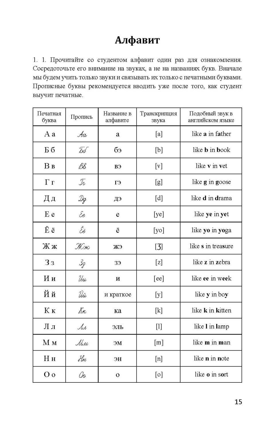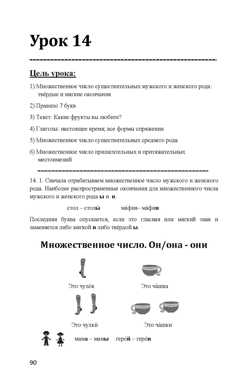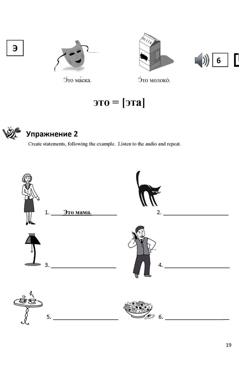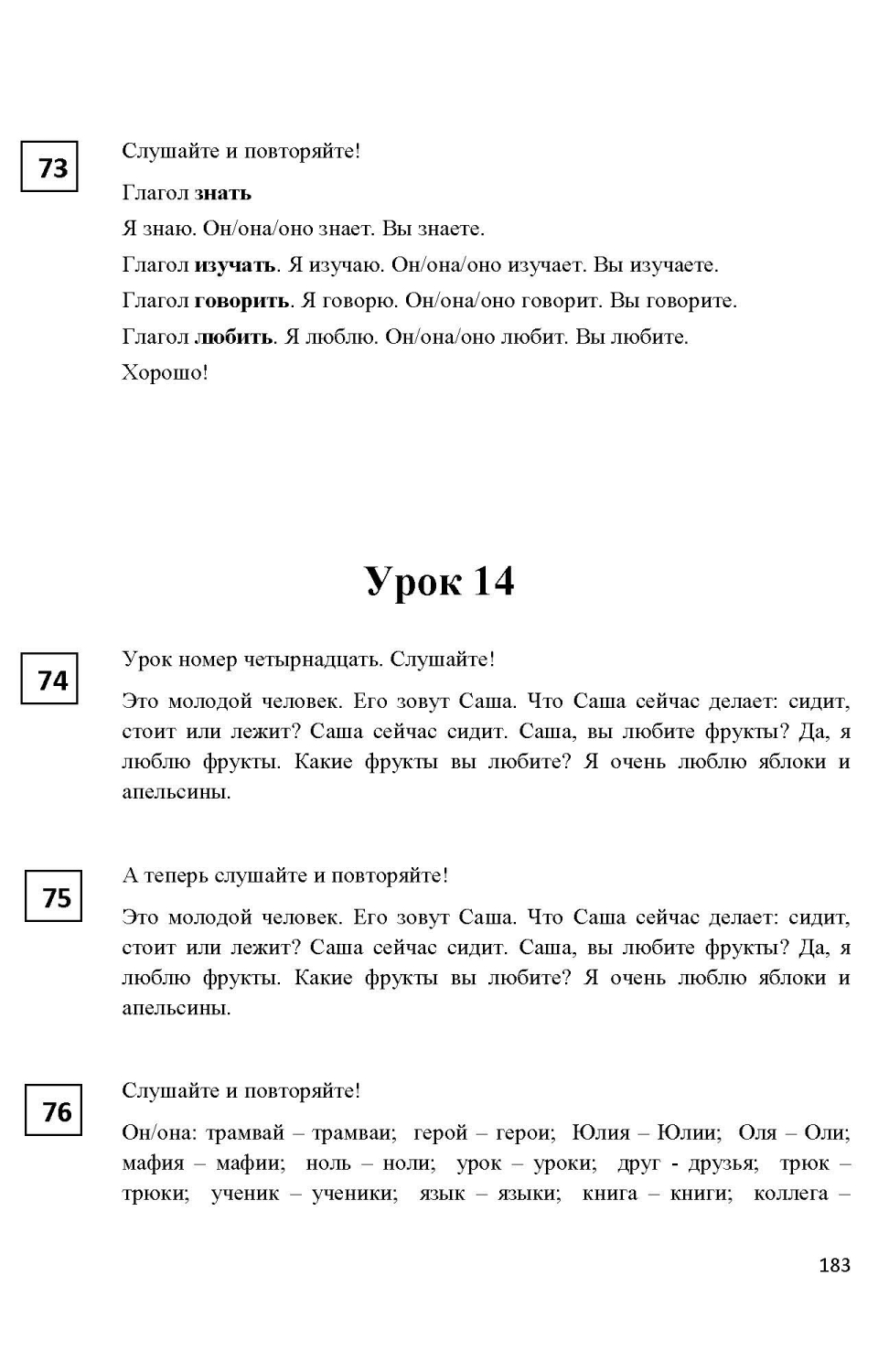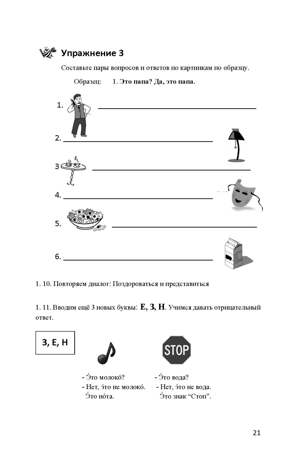 The first 6 lessons teach the students how to read and write in Russian. The Russian Alphabet is introduced in a special order that allows the students to start reading words and sentences from lesson one. The letters are supported by basic vocabulary and grammar structures that allow the student to speak from the very first page:
