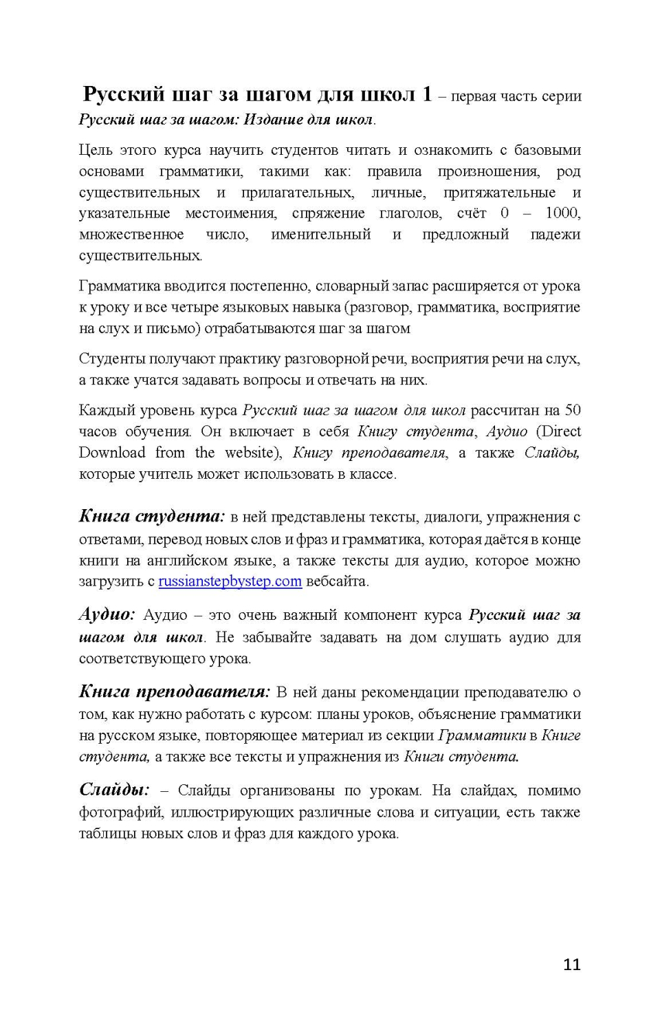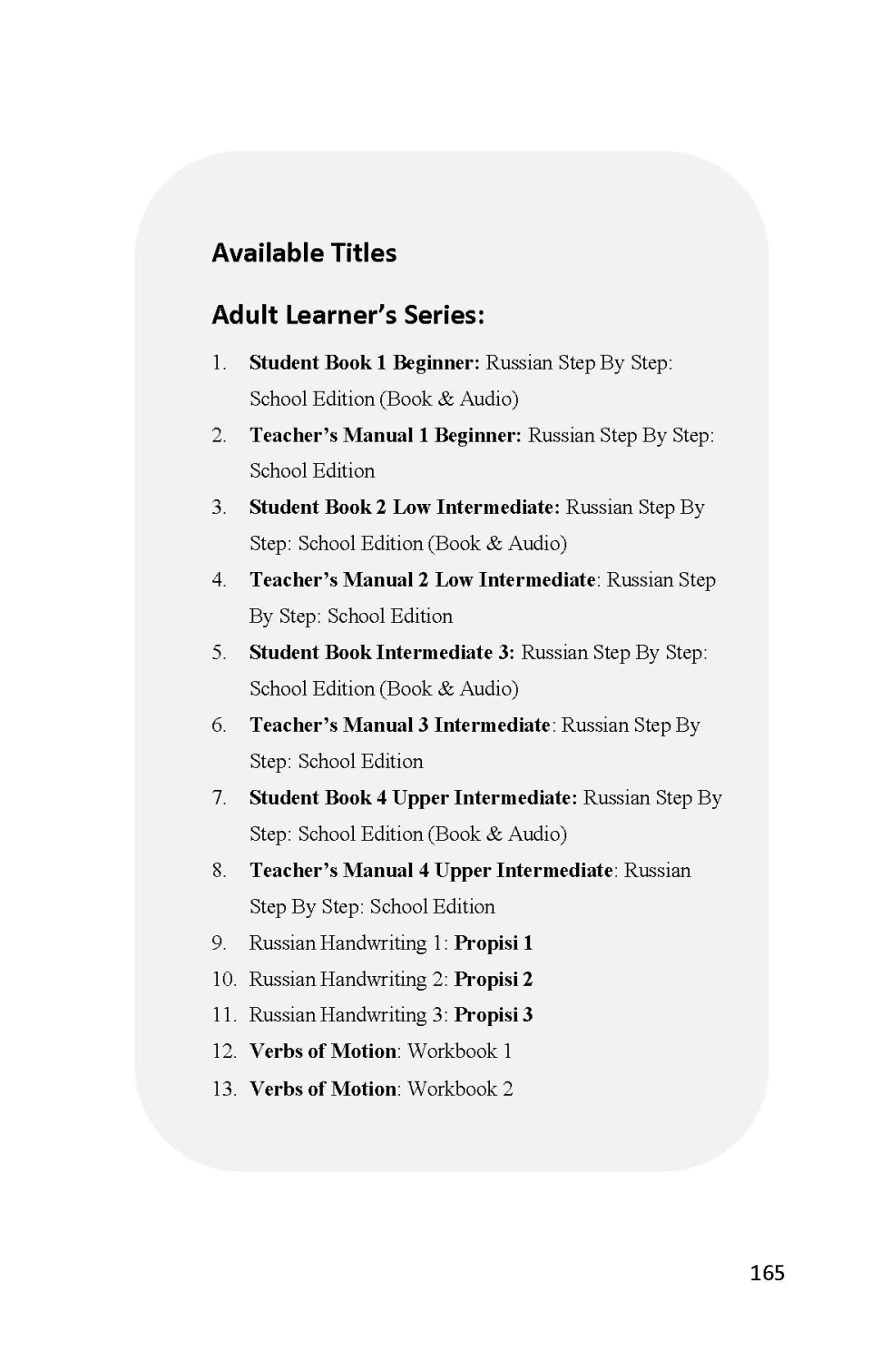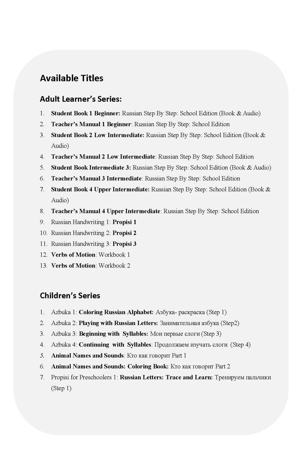 The teacher’s manual is designed to help the teacher minimize the prep work for each lesson. All the texts and exercises are listed in the order that we recommend. All the answers are listed in the teacher’s book, all the grammar and cultural points are presented for the teacher’s own information or to convey to the students. Each book also contains tips and tricks on how to better explain certain topics and review the old or cover the new material. Test are integrated throughout the book to help measure the students’ progress.